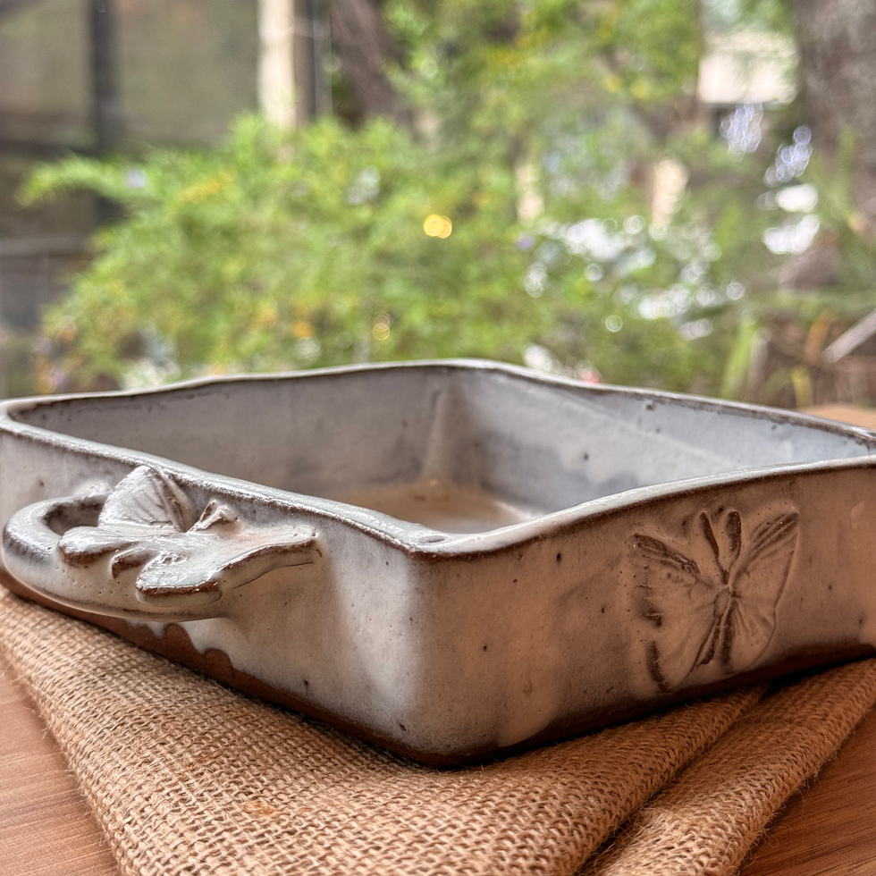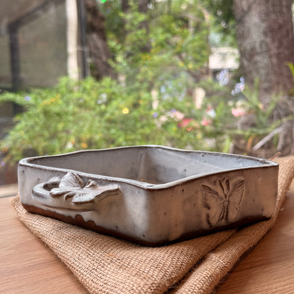 Servilletero de cerámica artesanal en tono neutro, decorado con delicados relieves de mariposas. Una pieza única que combina funcionalidad y encanto natural para vestir tu mesa con un aire sofisticado.